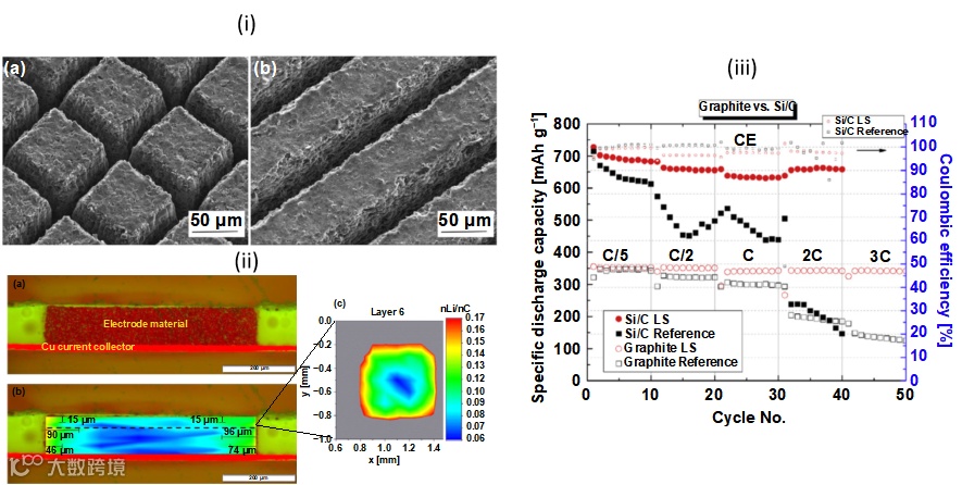 Zheng等人比较了硅/石墨(Si/C)的网格和线结构电极(图3(i))。他们认为相比于线结构电极,网格电极在克服电池使用过程中的各向同性体积膨胀和收缩问题上更具优势。比较石墨或硅/石墨激光结构化阳极电池和非结构化电极电池的性能。如图3(iii)所示,为最目前最先进的结构石墨电极的性能参数,在低功率(C/5)和高功率(3C)运行下均有恒定的容量值。这种性能的提高是因为石墨薄片具有优先取向,它平行于集电极,并垂直于锂离子通过电极的扩散方向,从而产生空间弯曲各向异性,并使扩散路径增长。而经过激光结构化,优先扩散平面与自由电解质接触,这使得沿微柱侧壁的高功率运行成为可能。