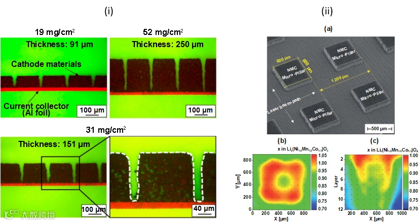 图4 (i)不同薄膜厚度的激光结构富镍NMC阴极截面图。(ii)(a)激光结构NMC厚膜模型电极的SEM图;(ii)(b)单微柱的锂浓度分布图(俯视),(ii)(c)电化学表征后的单微柱锂浓度分布图(横截面视图)