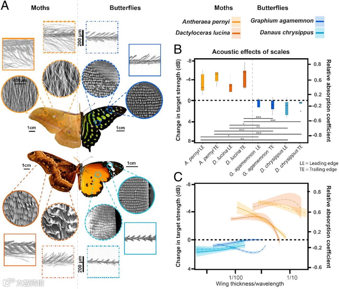 蝙蝠和飞蛾卷入了一场进化军备竞赛,蝙蝠利用超声波生物传感器,可以探测到昆虫猎物,反过来昆虫又会采取不同的策略来避免被捕食。飞蛾面临来自蝙蝠回声定位的巨大进化压力,进化出了一系列躲避策略,包括超声波灵敏的听觉来探测并逃脱觅食的蝙蝠,以及产生超声波滴答声来迷惑或警告攻击的蝙蝠。然而,许多蛾类没有对超声波敏感的耳朵,而是依靠其他防御机制。其中一种防御方法是声学伪装,通过超声波后向散射的进化,可以降低其可探测性。