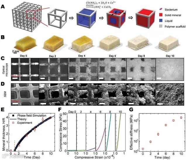 图2 晶格支架中细菌辅助的矿物质生长。A)细菌辅助矿物质生长过程的示意图。B-D)10天内细菌辅助矿物生长过程中的样品。E)实验观察、模拟相场和理论计算归一化矿物厚度随时间的变化。F)在10天内矿化样品的压缩应力与应变之间的关系。G)矿化样品在10天内的杨氏模量。