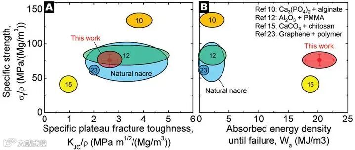 图4仿生矿化复合材料与天然和人造复合材料的力学性能比较。A)与天然珍珠母和其他人工矿化复合材料相比,仿生复合材料(IV型)的比强度与比断裂韧性的Ashby图。B)与竞争对手相比,仿生复合材料(IV型)失效前吸收能量密度的Ashby图。