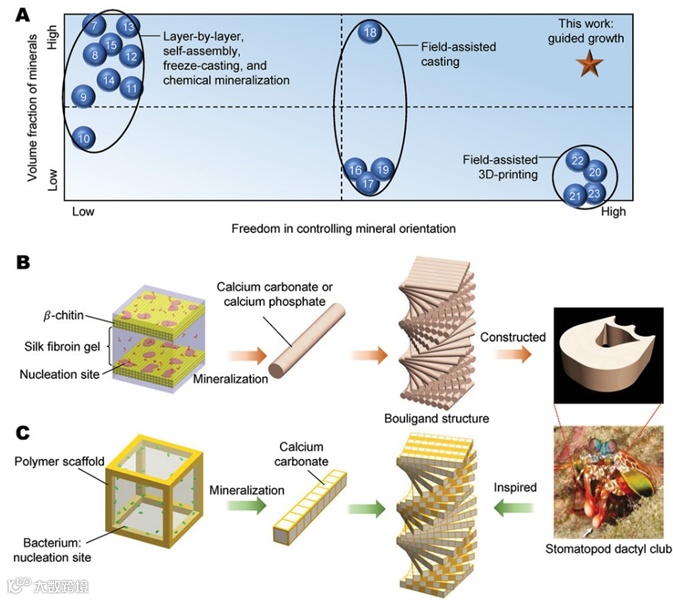 大自然已经提供了智慧,可以通过在精确控制的方向上直接生长高分率的矿物来应对这一挑战。当软体动物或节肢动物构建矿化的复合物时,会生成一种填充有丝素蛋白凝胶的不溶性β-甲壳质基质,可作为支撑。矿物质核心从β-几丁质基质的表面上形成,从富含asp的糖蛋白(作为成核位点)开始。然后,矿物将沿着脚手架引导的路径生长,以形成具有有序方向的微结构(例如口足类指趾中的Bouligand结构)。尽管自然生长策略非常复杂,但由于难以指导复杂的自然生长过程精确地遵循预先设计的路径,因此将策略转化为工程实践仍然具有挑战性。