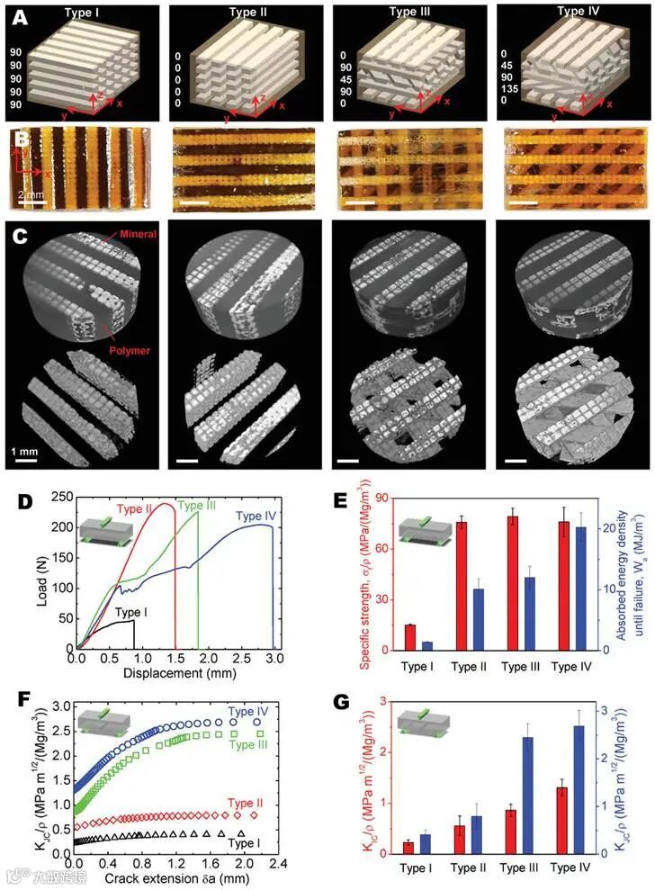 图3 不同矿物层朝向的仿生矿化复合材料。A)矿物纤维在不同层的复合材料上的铺层方向示意图。B)仿生矿化复合样品。C)仿生复合材料和矿物相的微CT扫描图像。D)矿物-聚合物复合材料三点弯曲试验载荷-位移曲线。E)在三点弯曲试验中,四种仿生复合材料的比强度和失效前的吸收能量密度。D)四种仿生复合材料在失效前所吸收的能量。F)抗裂曲线(R曲线)中的载荷-位移曲线的封闭区域,该曲线以特定应力强度作为裂纹扩展的函数表示。G)四种复合材料的裂纹生长和稳定裂纹扩展的断裂韧性。