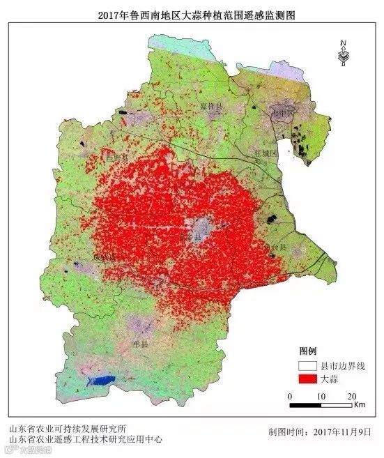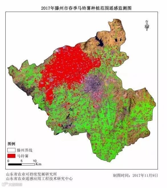 2017年4月至5月,遥感团队成员奔赴金乡、鱼台、成武、嘉祥、巨野等大蒜种植区和滕州、薛城、邹城、泗水、新泰、肥城等马铃薯种植区开展野外GPS定位调查,共获取大蒜、春季马铃薯地面样点200多个以及同期其他地物样点100多个。以地面样点为基础,建立大蒜和马铃薯的解译标志库,采用中等分辨率的多时相遥感影像和面向对象的方法,成功地提取了试验区春季马铃薯和大蒜的种植面积,总体精度达到92%。