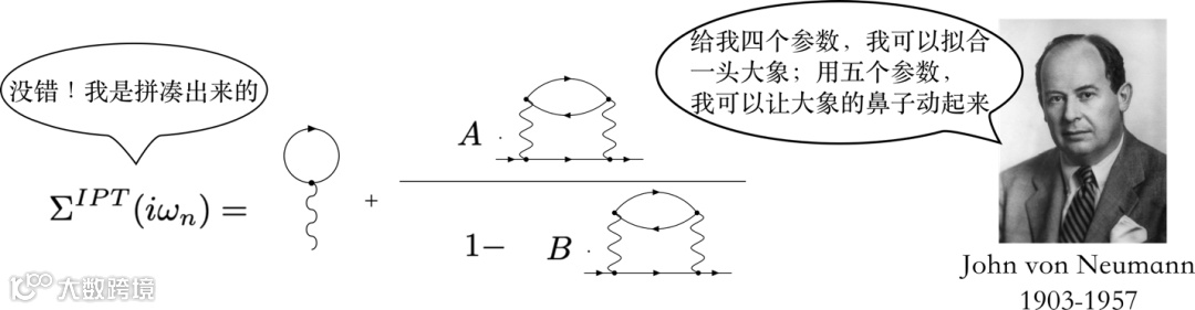 为了保持二阶微扰论这样的简单形式,同时使得计算出的自能同时在强耦合极限下也是定性合理的,人们大开脑洞,把二阶自能来了个变形,人为引入了两个参数A和B。多出来的两个参数使得人们可以分别拟合强弱两个极限下的自能的定性行为。这样保证了在相互作用的两端,这个方法计算出的自能都是定性正确的。这种方法被命名为Iterated perturbation theory,简称IPT [3-5]。当然,如果你还记得费米转述冯·诺依曼的话“用四个参数我可以拟合出一头大象,而用五个参数我可以让大象的鼻子动起来”,那么就会知道这样拼凑出来的方法是缺乏理论基础的,只是在某些情况下确实还挺好用而已。IPT同样可以直接工作在实频率空间,能够处理多轨道及掺杂情形。但是由于该方法缺乏确定的理论基础,在不同情形下其行为无法提前判断,需要仔细辨别。