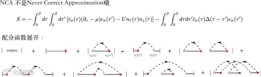 港科大的戴希老师2003年在科学杂志上发表的一篇文章就曾经使用此方法 [9]。在Hubbard-I的基础上,如果考虑杂质与周围耦合的微扰展开,并将所耦合项不相交的图形求和在一起,就得到了non-crossing approximation[7, 8]。该种方法显然比孤立Hubbard-I方法要进了一步,包含了杂质与周围环境的耦合效应。但是由于所包含的图形仍然过少,只适用于高温情况,并且扩展到多轨道情形具有较大的困难,使用的人也比较少。