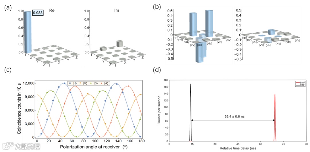 图3(a)光纤量子过程表示;(b)经过36.4mCTF后的偏振纠缠态表示;(c)偏振关联曲线;(d)单光子在36.4mCTF和SMF中的相对延迟时间。