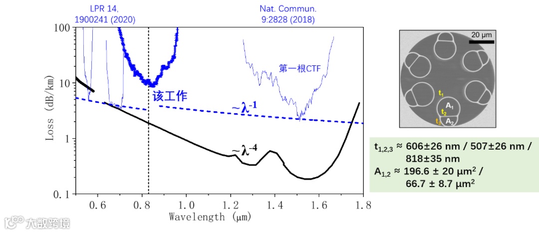 过去十年的诸多研究表明,以“内摆线型均匀厚度玻璃壁”和“径向方向多层玻璃壁排列”为核心特征的反谐振空芯光纤可能是实现低传输损耗的有效途径。由此,人们从光纤束缚态(bound states)导光的传统思维中解放出来,开始探索光纤泄漏模(leakage mode)导光的低损耗潜力。而且,泄漏模导光的传输损耗具有波长一次方倒数的形式,比瑞利散射损耗和表面散射损耗更有利于在短波长进行光传输。2020年,暨南大学与北京工业大学研究团队拉制出两款在可见光波段工作的反谐振空芯光纤,传输损耗在红光区域(680nm)与石英玻璃光纤相当,在绿光区域(558nm)比石英玻璃的瑞利散射损耗更低(Laser & Photonics Review 14, 1900241 (2020))。