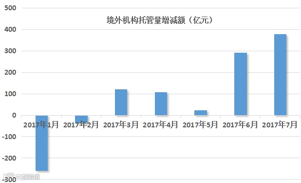 目前上清所还未公布7月债券托管数据。该所是银行间非金融企业信用债的主要存管机构。但上清所此前数据显示,6月份境外机构债券托管量为388.23亿元,创了2016年1月以来新高,并已连续四个月增加。