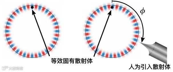 其实验原理是 :谐振腔的材料、形状等因素会产生固有的反向散射(图2左),实验中人为引入角度可控的散射体来抑制固有散射体产生的影响(图2右)。