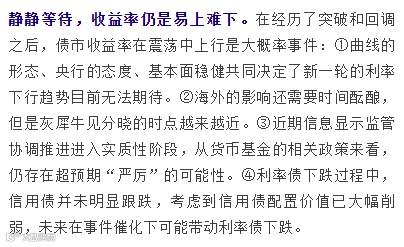 虽然短期内利多因素的释放将有利于利率的下行,但是这些利多因素难以延续,因此近期也有望确定短期内利率的底部。展望中期,在经济稳定的情况下,金融去杠杆还将继续推进,债市难有机会,建议机构短期内不可过于乐观,要注意利率底部的安全边际。