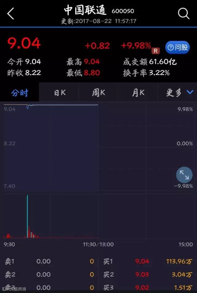 今日早盘中国联通再次一字涨停开盘。不过到10点钟,逾620万手封单突然撤单,巨大抛盘蜂拥而出,涨停板被打开,成交量迅速放大。不过随后又被封死。值得注意的是,今日上午中国联通成交额高达61.60亿元,尽管只有半日,也已创2016年12月1日以来新高。