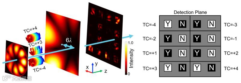 图3 超构神经网络识别复合涡旋束的示意图(以阶数为+3, ±4及偏移量为6λ 的涡旋束为例) 及测量平面的设计(可识别-4~+4阶的涡旋束,Y/N表明该阶数的有无).