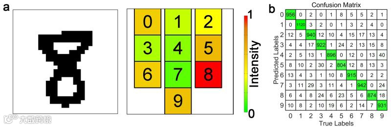 图1以识别手写体数字(0到9)的形状为例展示了超构神经网络的工作原理。后方探测区域划分为10个等大区域,分别代表数字0到9,超构神经网络会在所“认定”的数字对应区域上产生最强的能量输出。如图1所示,当平面波入射到数字8上,所产生的散射波经过超构神经网络后主要汇聚至“8”对应区域,使得该区域内的总能量远大于其他区域,从而成功识别出该手写数字几何形状。通过理论和实验验证了所设计的超构神经网络能够成功识别了手写体数字(0-9)的形状(如图2所示)。
