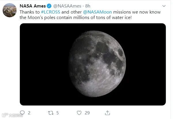 2009年10月9日,LCROSS任务中的探测器以5600英里每小时的速度,撞向月球南极卡比厄斯陨石坑(Cabeus Crater),结果证实了月球南极地区拥有大量的水。