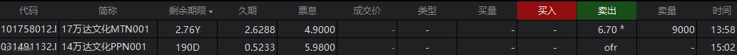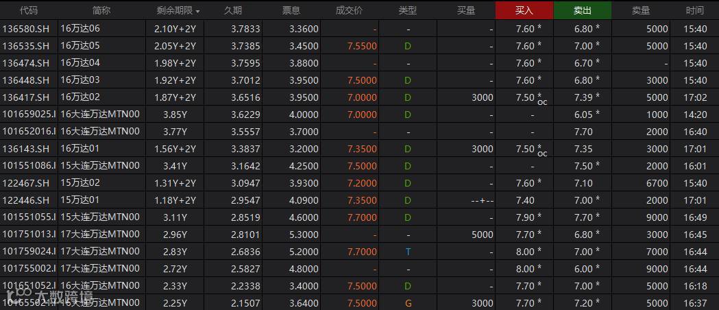 比如,万达商业在上证所发行上市的公司债15万达01一度成交在7.5%,前日中债估值4.98%,较估值上了250BP左右;在银行间市场发行的中票16大连万达MTN004,成交到7.5%,前日尾盘成交在5.43%,上了207BP。