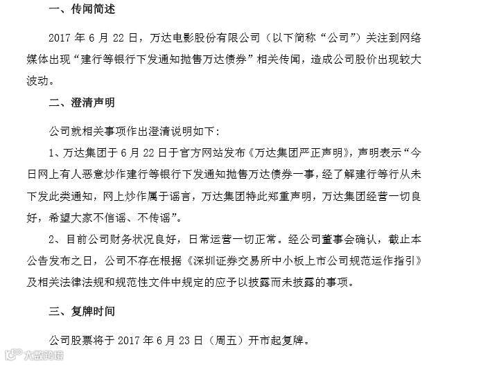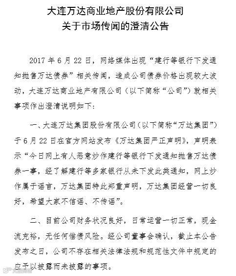 至22日中午,万达集团官网正式做出回应,万达集团称“经了解建行等行从未下发此类通知,网上炒作属于谣言。”