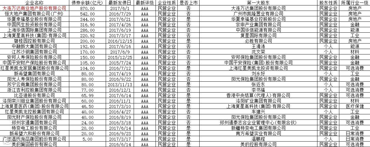 一则,评级很高。前述15万达01的发行人,万达旗下商业地产板块的万达商业是国内为数不多的获得3A评级的民企发行人。