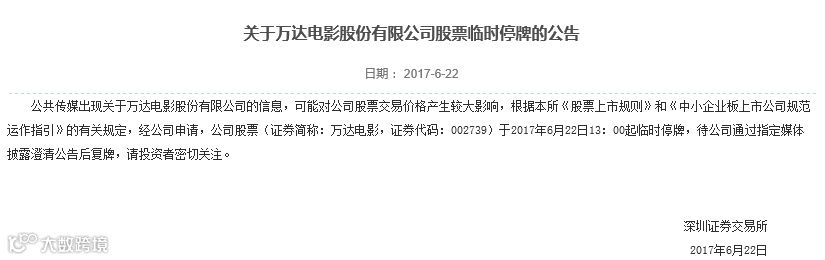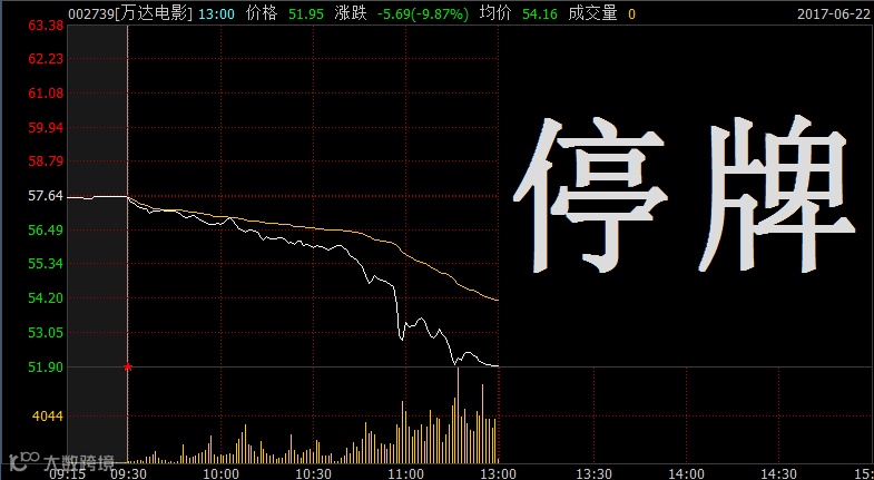 A股投资者很快嗅到了异样:万达旗下唯一的A股上市企业万达电影一度跌停,早盘收报51.95元,跌9.87%,午后宣告临停……
