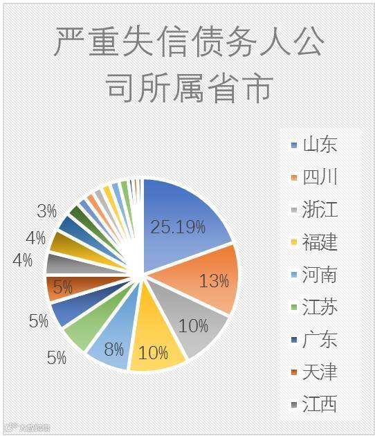 在严重失信债务人名单中,绝大多数企业为制造业与农副食品加工业,总占比大于50%。商贸业与房地产业紧随其后。而从地域来看,所属山东的失信企业最多,约占20%。