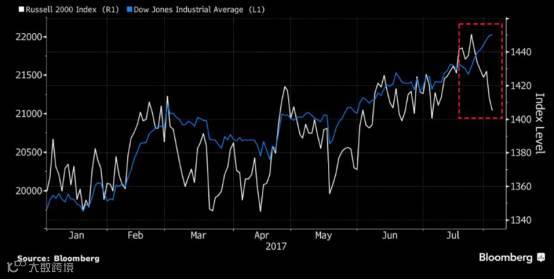 7月下旬以来,罗素2000指数与道指“分道扬镳”:
