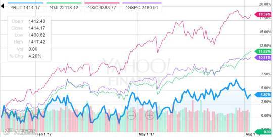 事实上今年以来,美股小盘股的表现一直落后大市。2017年迄今,纳斯达克综合指数(红)上涨18.6%,道琼斯工业平均指数(绿)上涨11.9%,标普500指数(紫)上涨10.8%。相比之下,罗素2000指数(蓝)仅上涨4.2%,被三大指数远远甩在身后。