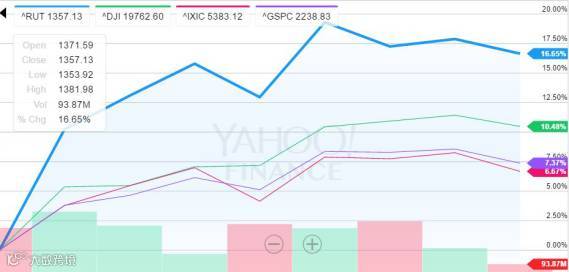 罗素2000大幅落后于三大股指的情形与去年底美国大选结束后的行情形成鲜明反差。去年11月4日至11月25日期间,罗素2000指数曾连续十五个交易日上涨,创1996年2月以来最长连涨周期,此间累计涨幅超过16%,显著跑赢大盘股指数,并不断创出历史新高。