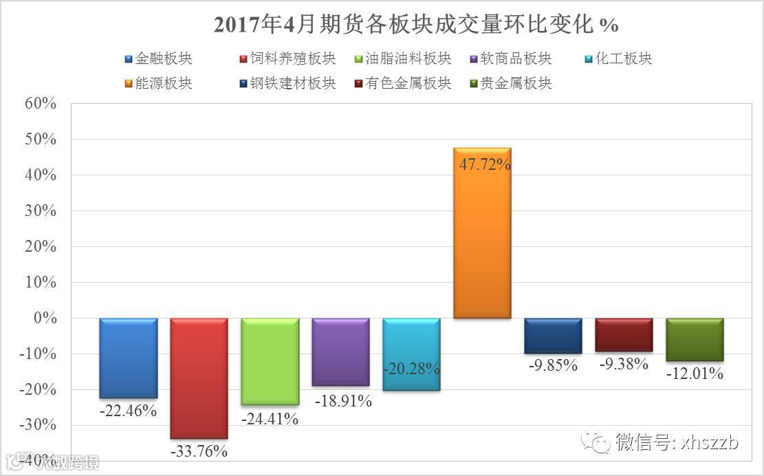 方正中期期货研究院院长王骏告诉中国证券报(ID:xhszzb)记者,4月商品期货市场除能源板块成交规模大幅增长外,其余板块的成交量和成交额均处于下降态势。其中,饲料养殖板块成交量环比下降近34%,油脂油料、化工、金融板块成交量下降逾20%,软商品板块成交量也也下降了逾18%。