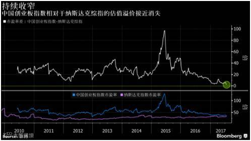 据此前彭博报道,中国创业板指数估值即将首次低于纳斯达克综指,估值之差收窄至中国创业板指数2010年启动以来最小。中国创业板指数基于已公布业绩的市盈率目前为36.2倍,略高于纳斯达克综指的34.3倍。