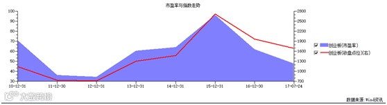 创业板指和美国纳斯达克指数构成相似,都属于科技股占比较高的指数。因此二者的市盈率也常常被拿来比较。不过二者近期命运可大不同:进入2017年以来,创业板指累计下跌14.05%;而同期纳斯达克综指上涨18.66%。