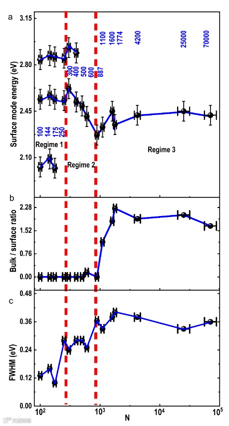 如下图所示,研究者对不同原子数团簇的等离激元性质进行研究和比较,发现可以按照原子数(N),划分出三个界限清晰的物理区域: