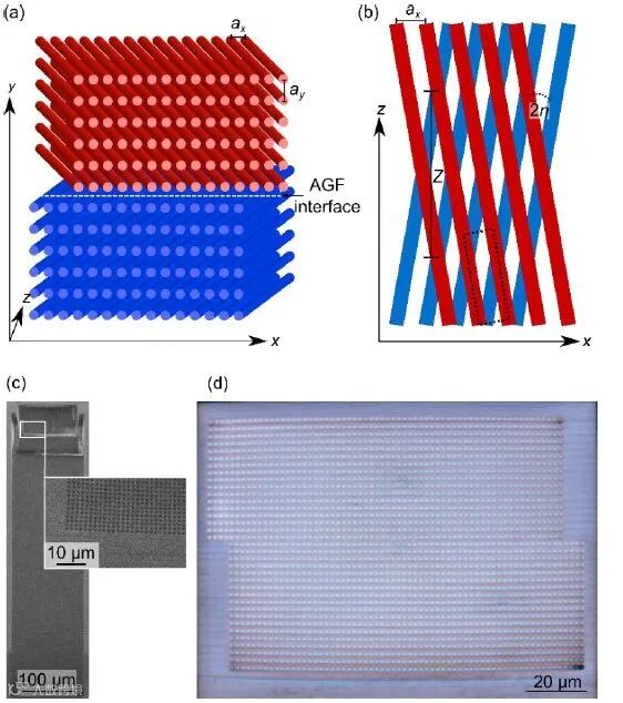 图1 人工规范场界面的示意图。两个矩形波导阵列(红色:上部阵列,蓝色:下部阵列)相互堆叠,在y方向形成一个人造GF界面。波导阵列相互倾斜2η。否则,两个数组的参数是相同的。(a)前视图;(b)俯视图;虚线框表示上部阵列中x-z平面中的一个单元单元。(c)反向制作波导样品侧面的扫描电镜图像。插图显示了一个放大区域,可以看到空心波导。(d)从顶部渗透样本的显微镜图像。