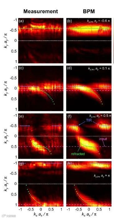 图4 实验测得的人工规范场界面的折射和反射。不同输入波的空间功率谱(傅里叶空间中的强度)始终在y轴的同一位置发射。左栏和右栏分别描述了实验和模拟结果,白色点显示了根据公式分析计算的值。(a-b)光束远离界面,没有折射现场;而对于其他面板,可以看到部分折射和反射。