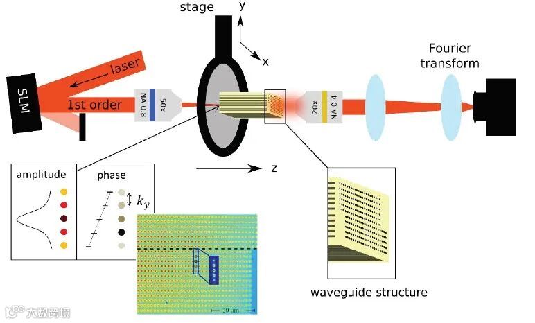 图3 人工规范场反射折射现象的实验装置:激光束(波长700nm)从SLM上反射,SLM在光束上印上特定的相位和振幅图案。为了在使用纯相位SLM的情况下形成振幅,在SLM上覆盖一个闪耀光栅,该光栅将部分反射光转换为第一衍射级。经物镜傅里叶变换后,光束由五个点组成,插图表示每个点之间的相位差和高斯振幅包络。这些斑点集中在界面下方的一排波导上,如样品顶部光束的假彩色照片所示,界面用虚线标记。然后,光沿着z方向传播,与界面相互作用,并在传播距离为725µm后离开样品。输出面处的强度分布由相机成像,其空间功率谱(通过在距相机的焦距处插入额外的透镜获得)。