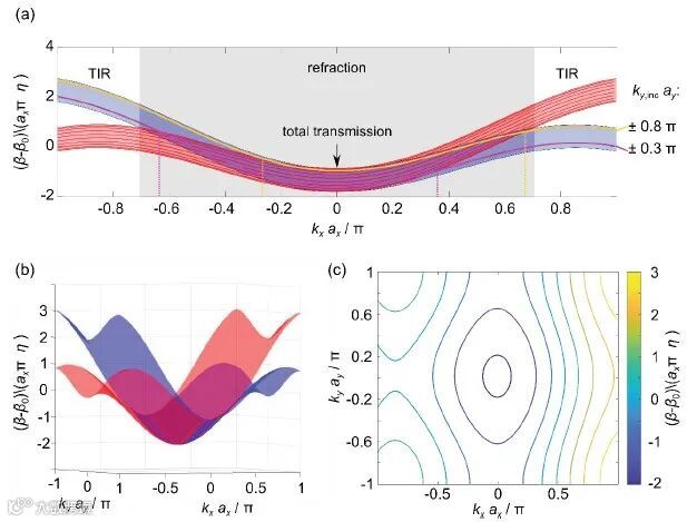 图2 人工规范场界面两侧(上部、红色和下部、蓝色阵列)的色散关系。(a)二维色散关系图,在两个波段重叠的范围内,任何穿过人工规范界面的波包都会根据广义斯内尔定律(阴影灰色区域)进行折射。在这个范围之外,会发生全内反射(TIR)。(b)三维色散关系图(c)图(a)中红线对应的等高线图。波包在每个点的群速度垂直于穿过该点的等高线。
