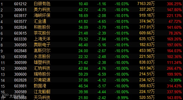 4月17日,次新股板块重挫。Wind次新股指数下跌6.16%,领跌所有概念板块。个股中,129只正常交易的次新股有120只下跌,占比93%。其中白银有色、美力科技、海峡环保、汇金通等28只成份股跌停。