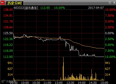 4月7日超讯通信原本跌幅在2.5%附近,午后突然放量跳水,未几跌停。