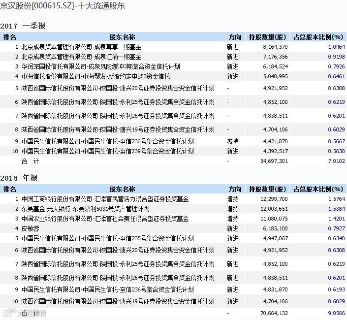 京汉股份披露的2016年年报显示,有6只信托计划“先知先觉”在去年四季度新进前十大流通股股东,位列第5至第10。到今年一季度,更是有8个信托计划成为十大流通股东。