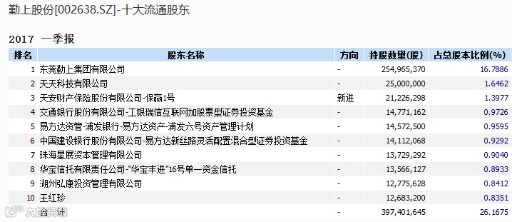 以勤上股份为例,其前十大流通股东中,天安财产保险股份有限公司-保赢1号、交通银行股份有限公司-工银瑞信互联网加股票型证券投资基金、易方达资管-浦发银行-易方达资产-浦发六号资产管理计划、中国建设银行股份有限公司-易方达新丝路灵活配置混合型证券投资基金、华宝信托有限责任公司-“华宝丰进”16号单一资金信托分别位列其第三、四、五、六、八大流通股东。