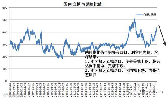 “统计数据显示,国内白糖与原糖走势相关系数达0.78,但局部会出现背离现象,比如2007年6月前后、2008年6月前后、2010年6月前后、2015年6月前后和2017年5月,呈现出非常明显的内强外弱。这主要是因为国内糖的进出口控制非常严格,不过最终将会回归均值。”姚永源说。