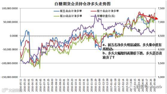 2017年以来,白糖期货价格震荡区间虽然只有400点左右,但是多空会员持仓均持续大幅增持,可见多空博弈激烈。姚永源指出,从净持仓角度看,在2017年1月3日,前20名会员、前10名会员、前5名会员持仓净多单数量分别为7372张、7358张、-757张;而到了2017年5月9日该数值变为70123张、81406张、56824张。这表明,在弱势震荡下跌的过程中,白糖期货市场多头集中度大幅增加。从前5名持仓会员变动还可发现,净多头曲线出现明显下跌趋势,说明核心多头情绪松动,利空糖价。