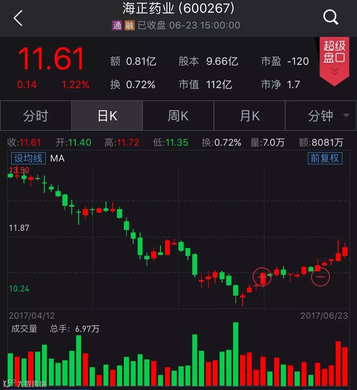 海正药业一季报净利润683.19万元,同比增12.50%,营收27.38亿元,同比增14.96%,目前股价自阶段低点反弹,涨幅为11.78%。