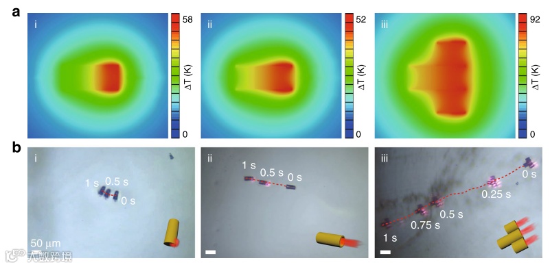 该研究中的微型机器人是通过光热驱动的,研究者分别讨论了微棒状、微管状及多喷嘴火箭状微型机器人的驱动效果。如图4a中有限元分析结果所示,当利用近红外光激发微型火箭机器人的尾部时,火箭尾部的温度显著高于头部温度,这种非对称性温度梯度产生的热泳力能够直接将微型机器人向前推进。此外,除了这种自热力外,中空微管结构还有利于形成管内光热能量集中,以高强热流的形式从管中喷出。因此,相比于实心微棒结构,中空微管结构的引入大大提升了微型机器人的驱动速度。如图4b所示,在相同的时间内(1 s),多喷嘴火箭微型机器人的前进距离最大(777.4 um),驱动速度比单个微管机器人快大约3倍,比微棒状机器人快大约7.5倍!