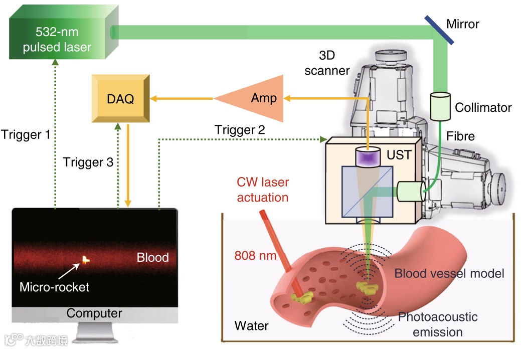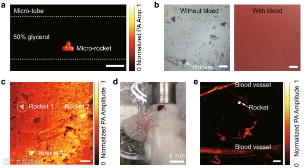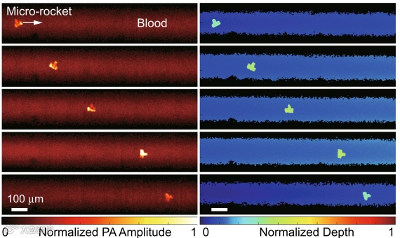 图7. 微型火箭机器人在血液中的光声成像和跟踪。