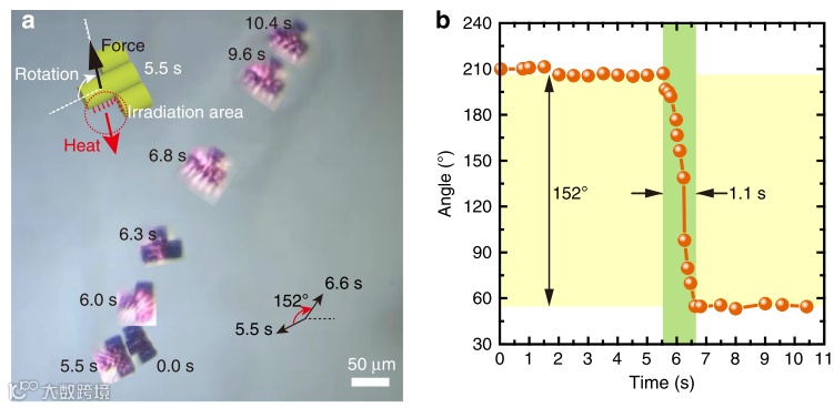 图5. 微型火箭机器人的运动控制(a)及其运动角度随时间的变化(b)。