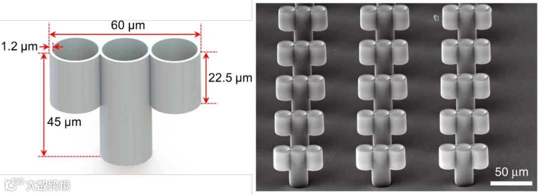 为了有效地在血液这种高粘度液体中输送微型机器人,就需要产生很高的瞬时推进力。研究者借鉴了大自然中常见的界面增强效应(如荷叶疏水),在微型机器人的结构上设计了类似于火箭的多喷嘴三维(3D)结构,增加了“火箭”的推进通道以及光激发区域的面积,有效地将驱动速度提升了三倍。如图2所示,微型火箭机器人是通过激光直写3D打印制造的,激光直写技术具有很高的分辨率,因此十分适用于3D空心微结构的阵列化制造。