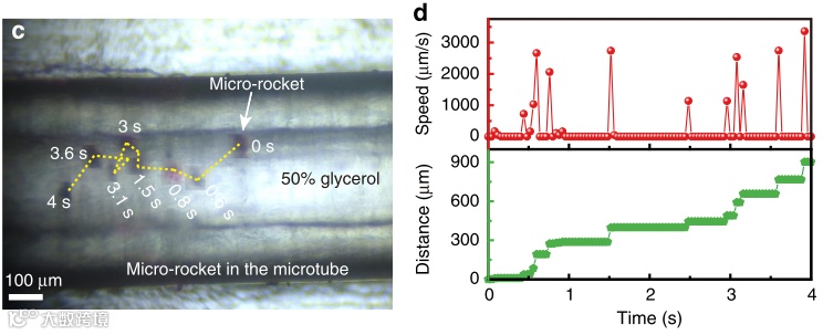 如图6,研究者利用内径250 µm的橡胶微管灌注50%甘油模拟人体的静态血管,微型火箭机器人在光驱动下能够以225.3 µm / s的平均速度和最大3.4 mm / s的瞬时速度进行自由移动。根据已知研究,这是目前粘性微管中尺寸大约50 µm的微型机器人所能实现的最高移动速度记录。