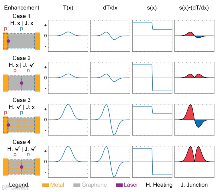 为了更好地说明光加热区域中心和p-n结之间的空间重叠对最大石墨烯光电流产生的重要性,只考虑一维方向,如图1所示,最后一列每条曲线下的面积就是PTE电流。根据光加热和电结增强的情况,该图分四种情形,第一种情况代表最原始的石墨烯光电探测器,仅由金属触点和石墨烯组成,既没有加热也没有电结增强。由于掺杂水平的差异,被积函数的正负贡献不等,导致PTE电流不为零。过去的一些研究工作使用了强电结控制而没有等离子体增强的石墨烯PTE效应,属于第二种情况,这里在温度梯度的中心引入了一个p-n结,保证了对两边的PTE电流的正贡献。而等离子体结构有助于将光转化为局部加热,大多数之前证明过的等离子体增强石墨烯光电探测器属于情况三。显然,同时具有光加热和电结增强的第四种情况产生最强的光电流,即该研究设计的主要部分。