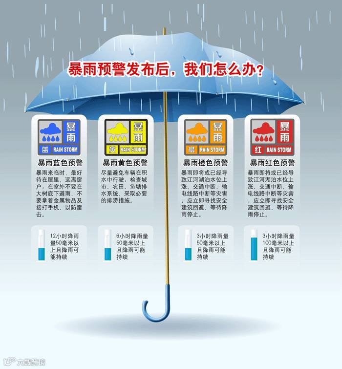 蓝色暴雨警告信号出现时,表示未来数小时内可能出现暴雨或雷雨大风等恶劣天气,如有远足、郊游等计划,请仔细考虑是否适合进行,若出行,要随时关注天空状况和气象部门的提示。当出现了黄色、橙色和红色信号时,一般是在恶劣天气已经影响本地,而且可能持续甚至变得更恶劣的时候发布。如非必要,人们应该尽可能留在安全地点直到信号解除,并做好意外发生的准备。