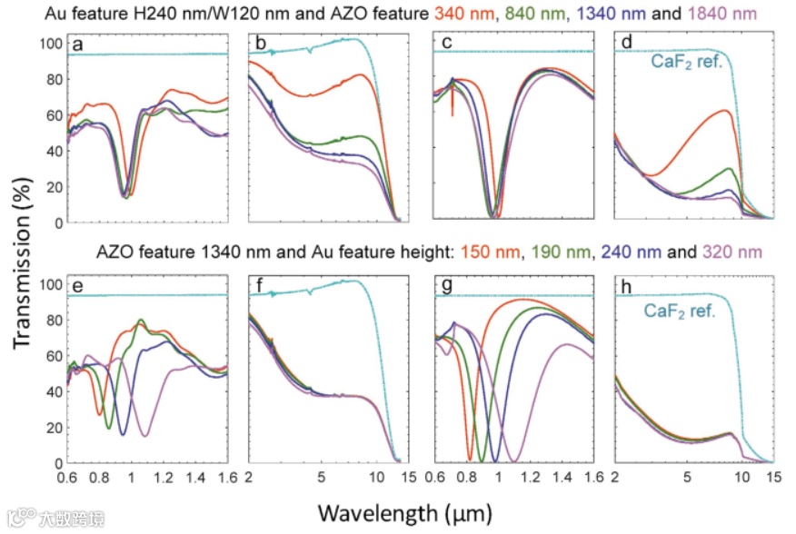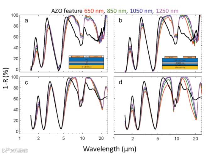 基于这种新型的微纳结构图形化技术,制备出了两种器件。首先该团队制备出了一种可用于卫星辐射制冷功能的光学太阳能反射器(Optical Solar Reflector,OSR),通过氧等离子体图形化技术,制备出了一种表面光滑的OSR器件,与传统的刻蚀而加工的微纳结构OSR相比,在红外波段产生几乎相同的红外辐射光谱(如图3所示)。其次,该团队利用该技术在AZO光滑超表面上集成可见波段金超表面,实现了一种独立调控可见光波段以及红外波段的复合超表面器件(如图4所示)。导电氧化物薄膜的局域载流子调控为基于金属氧化物的光学和纳米电子学提供了一种新的图形化思路,同时为实现多波段调控的复合超表面器件开辟了一种新的途径。